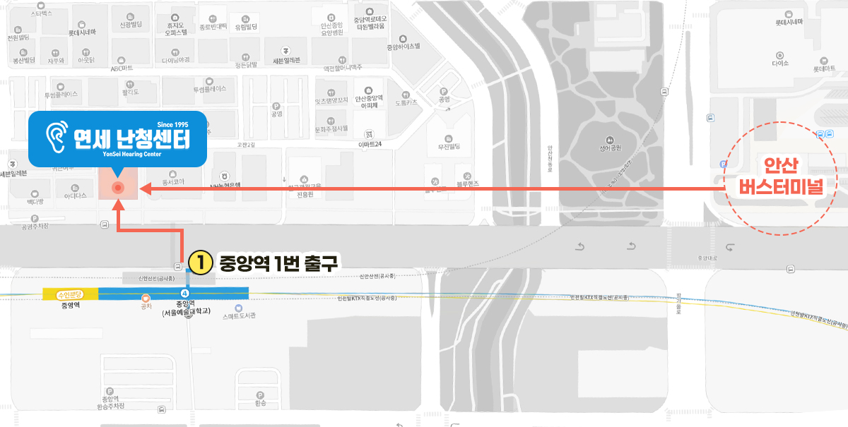 | 중앙역에서 하차 후 1번출구(역 앞쪽)으로 나오신 뒤 지하도를 이용하여 중앙역 건너편으로 오시면 바로 앞 1층 아트박스(Art Box)가 있는 월드코아 건물 5층에 위치해 있습니다. |