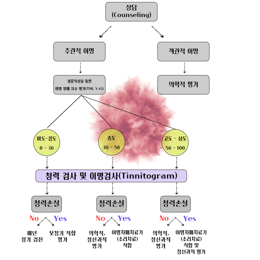주관적 이명 대상자를 위한 재활방법에는 상담(counseling), 소리치료(sound therapy), 이명재훈련치료(Tinnitus Retraining Therapy, TRT) 등 다양한 재활방법이 있으나 이명에 대한 반응의 변화를 직접적으로 유도하는 재활방법은 소리치료가 대표적이며 이명의 완화 또는 습관화를 유도할 수 있는 재활방법 중 하나로 분류할 수 있습니다.